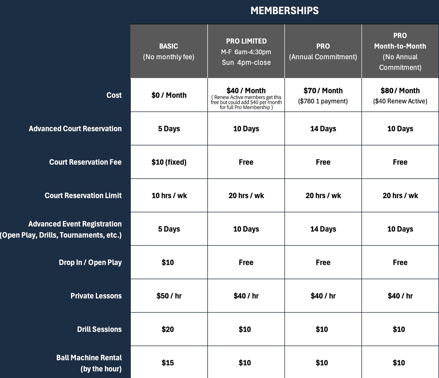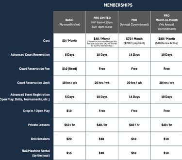 4. What are the primary benefits of a paid membership? The ability to reserve a court up to 10 - 14 days in advance (depending on which "Pro" membership), register for an event 10 - 14 days in advance, reduced fees for H2P events, free open play, and higher playing limits per week.